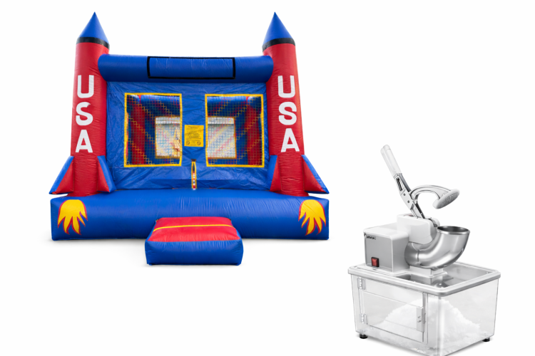 10x10 Rocket Bounce HouseChoose Package:10x10 Rocket Bounce House103259579_3259573_32595511000 A compact 10x10 bounce house designed to bring out-their-seat excitement without taking over your yard or event space. Dressed in bold red, white, and blue with rocket-inspired towers and decorative flame accents, this unit offers a playful, patriotic look that works great for birthdays, school events, block parties, and vendor areas. Its small footprint makes it easy to position in tighter spaces while still delivering a safe, sheltered bouncing area for a handful of kids. Mesh windows on the front and sides keep things well-ventilated and visible, and the low step-in ramp helps younger jumpers get in and out easily. Practical, eye-catching, and simple to set up, this bounce house gives reliable fun and a memorable theme without overwhelming your site or décor.15x15 USA RocketChoose Package:15x15 USA Rocket103259579_3259573_32595491000 A bold, 15x15-foot inflatable play space designed with a patriotic USA rocket theme — perfect for backyard parties, community events, and school functions. This rental offers a roomy, square jumping area with tall, colorful sidewalls and eye-catching rocket and flag graphics that spark imagination and keep kids engaged. Built for easy setup and safe play, it includes durable, puncture-resistant material, secure anchor points, and mesh panels for visibility and airflow so parents can watch while children romping inside stay comfortable. The size fits most residential yards and many park spaces, accommodating multiple small children or a few older kids at once while meeting typical safety spacing and weight guidelines. Lightweight enough for straightforward delivery and placement but robust enough for repeated use, this inflatable blends festive, space-themed excitement with practical rental features: quick inflation, simple cleanup, and a compact packed footprint for transport. Ideal for Fourth of July celebrations, birthday parties with a space or patriotic twist, and any event where you want a safe, visually striking centerpiece that invites active, imaginative play.Standard Pink Bounce HouseChoose Package:Standard Pink Bounce House103259579_3259573_30327511000 A charming Standard Pink Bounce House that brings classic castle-style fun to backyard parties, playdates, or community events — perfect for toddlers through young kids who want to jump, giggle, and burn energy in a safe, contained space. This inflatable features four pointed turrets, mesh side windows for airflow and visibility, a large front entrance with a small padded step for easy access, and bright pink-and-purple vinyl that reads like a birthday-ready backdrop. It’s designed for active bouncing and light play, keeps supervising adults in view through the mesh, and sets up on a flat surface outdoors or in a roomy indoor area. Simple, eye-catching, and kid-friendly — a dependable pick for adding color and nonstop bounce to any celebration.Snow Cone MachineChoose Package:Snow Cone Machine103259579_3259575_32269171100 Bring cool, colorful fun to any event with this Snow Cone Machine. Perfect for birthday parties, school events, company picnics, or community gatherings, it quickly turns blocks of ice into fluffy, snow‑like shavings ready for flavored syrup. Simple to operate, just add ice, shave, and serve. Rental includes 2 syrups (red & blue) and paper cones. Syrups provided can serve up to 60 people. This is a great, family‑friendly addition that keeps everyone refreshed and smiling.*Only available with bounce house/waterslide rental*